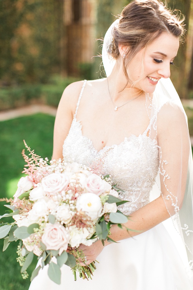 The four-tier white wedding had two layers done in a dot design and two in a scroll design. It was adorned with blush and white roses and topped with a sparkly Mr. and Mrs. ornament.