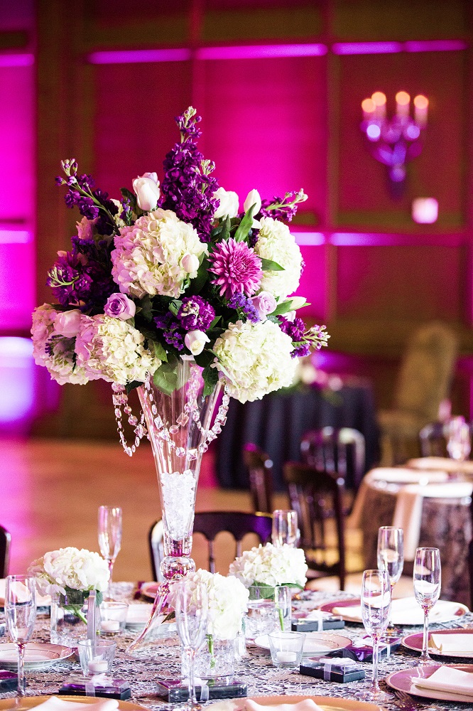 A plated dinner started with salad, followed by chicken and beef with green beans and potatoes. The three-tiered wedding cake consisted of white, lavender, and purple fondant, complete with white lace fondant on the first and third layers, and gumpaste flower embellishments.