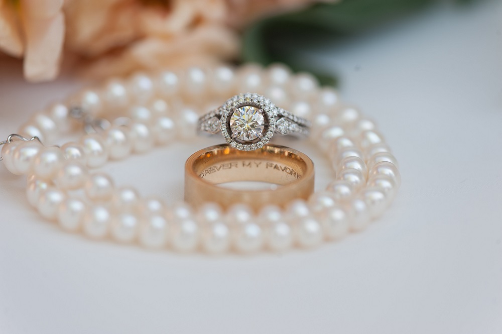 Lauren donned a Morilee wedding dress from the Blu Collection, which she purchased from Brilliant Bridal in Phoenix and came with a sweetheart neckline and a ballgown skirt with a train. A lengthy veil was pinned in her hair with a jeweled headband, and she wore a single strand of pearls. She held a large bouquet of white roses and hydrangeas, and her bridesmaids held bouquets of coral and pink roses and white hydrangeas. They wore tea-length, brilliant red dresses with varying necklines.