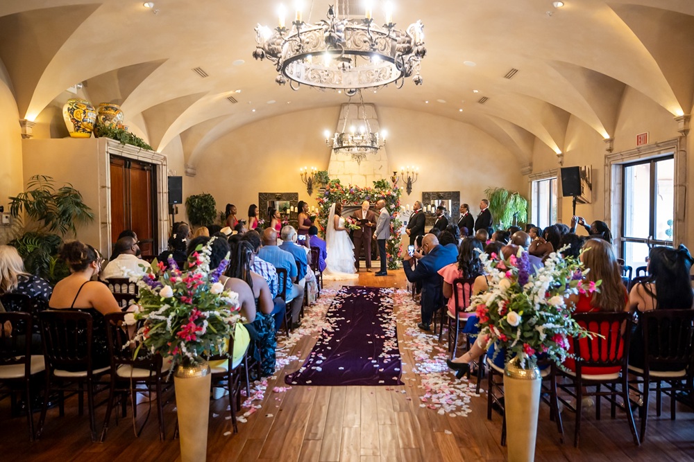 Their indoor ceremony was elegant and romantic, beautifully accented with their bold wedding palette of hot pink and violet. The bridesmaids glowed in vibrant hot pink gowns, while the maid of honor stood out in a rich purple dress. The groomsmen complemented the color story perfectly in classic black suits.