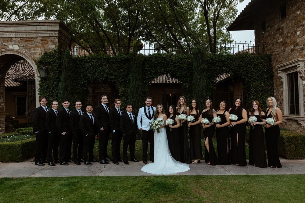 Amy wore a beautiful strapless gown, and Max matched her with a white suit. The wedding party was dressed up in all black, which gave the wedding an elegant and classy feel. The ladies had stunning white bouquets which only added to the aesthetic.