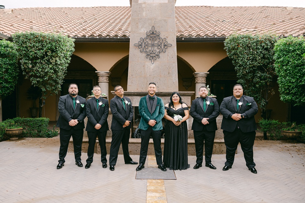 Their floral design featured a cheerful mix of classic roses and an assortment of white florals, perfectly balancing elegance with warmth. The bridal party looked stunning in black and dark green attire, with five bridesmaids, five groomsmen and one groomswoman complementing the venue’s timeless style.