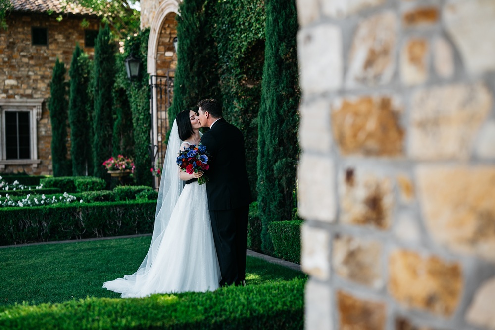 Courtney was gorgeous in a sleeveless ballgown with a plunging illusion V neckline, illusion side slits on the bodice, and a full skirt. She accessorized with drop earrings and a full-length veil. Her bouquet was composed of flowers in bold colors such as blue, red, and orange.