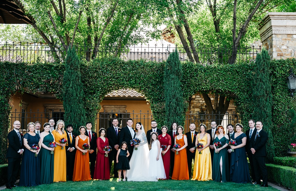 The bride and groom both had male and female attendants. The ladies wore individual dresses in a rainbow of colors and carried smaller versions of the bride’s bouquet. The gentlemen wore black suits with white shirts, ties in a rainbow of colors with matching pocket squares, and red flower boutonnieres.
