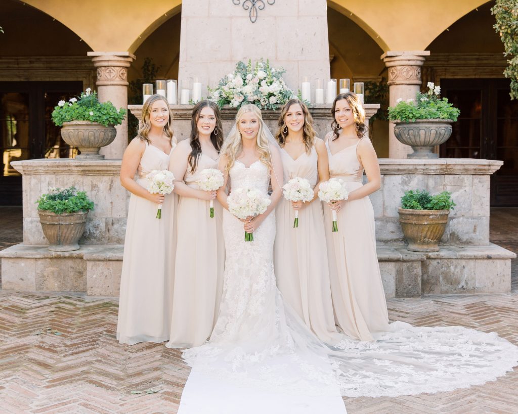 The January wedding was filled with beautiful, classically elegant touches. The couple chose a simple, understated color scheme of white and cream, which really made the touches of green and pink in their floral arrangements pop! The bridesmaids wore long, cream-colored gowns, while the groom and his groomsmen wore classic black tuxes with cream bow ties and cummerbunds.