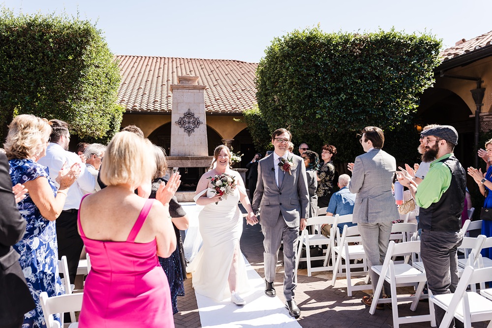 Grace was radiant in an off-the-shoulder fit-and-flare gown with a slit skirt and a train. Her accessories included a pearl necklace, jeweled headband, full-length veil and white bridal sneakers. Her bouquet was composed of assorted flowers in shades of white, pink, and gray. Her three bridesmaids wore individual full-length dark red dresses. They carried smaller versions of the bride’s bouquet.