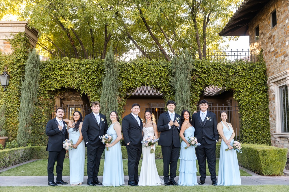 Kambria was surrounded by bridesmaids wearing light blue gowns in a mix of flattering styles, adding texture and personality while staying perfectly coordinated. Luke and his groomsmen looked sharp in classic black tuxes, finished with light blue ties that tied seamlessly into the overall theme. Every detail felt thoughtfully curated, from attire to décor.