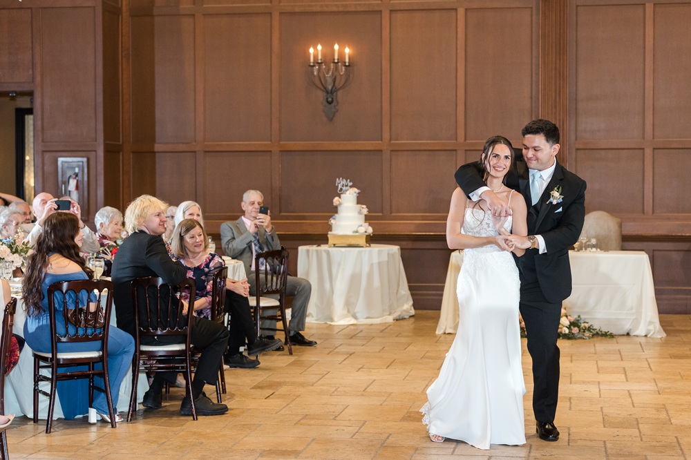 After an outdoor ceremony, the reception featured a comforting yet elevated dinner menu, beginning with a classic Caesar salad and followed by creamy mashed potatoes, tortellini primavera, grilled Tuscan chicken, and tender beef tenderloin. For dessert, guests enjoyed a stunning multi-flavored cake offering vanilla, churro, and almond layers, all beautifully decorated with fresh florals.