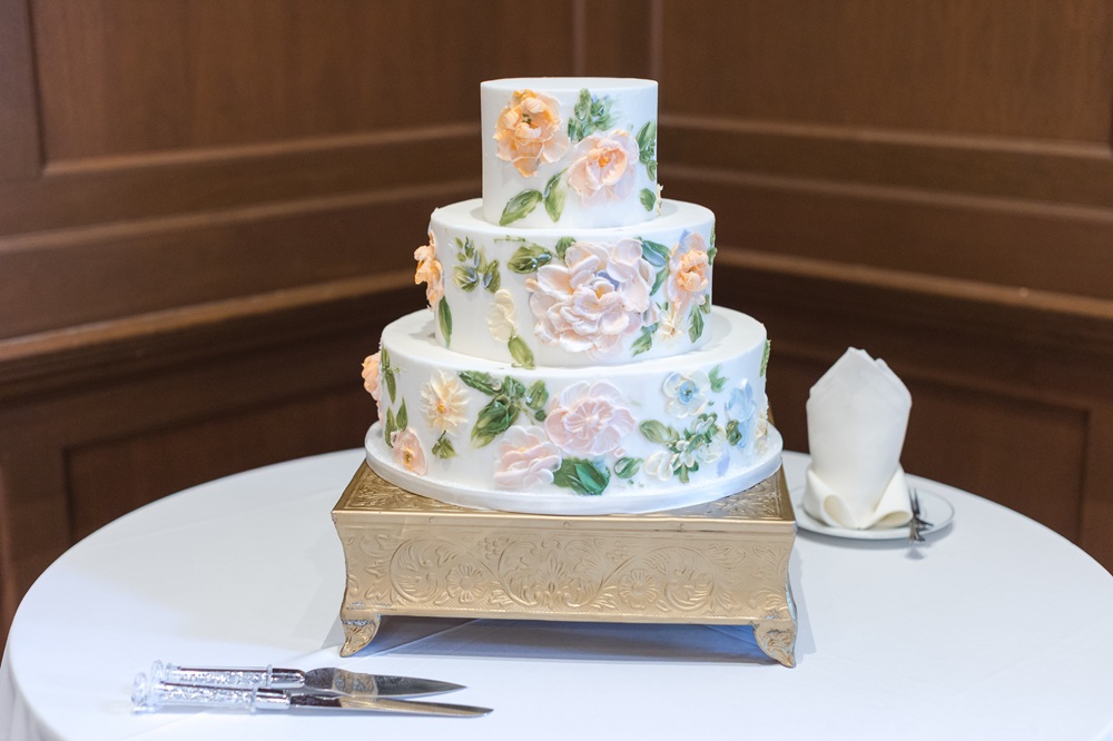 The three-tier wedding cake was white and decorated with frosting in a floral pattern. Each layer was a different flavor.