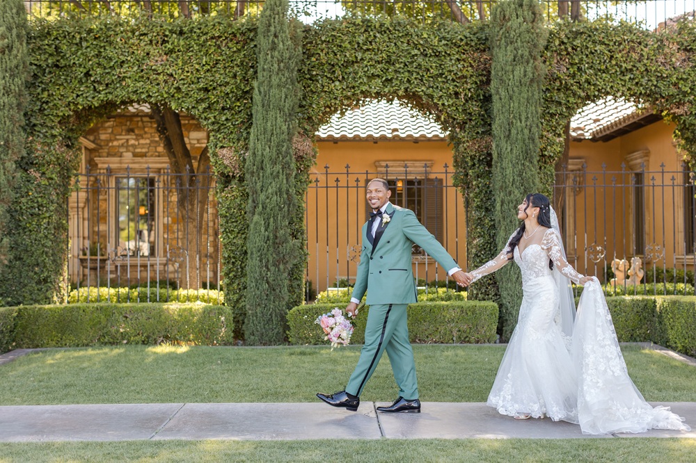 Marcus got married in a sage green tuxedo with black buttons and lapels, white shirt, black bow tie, and white rose boutonniere. His four groomsmen wore tan suits with white shirts, floral ties, white pocket squares, and white rose boutonnieres.
