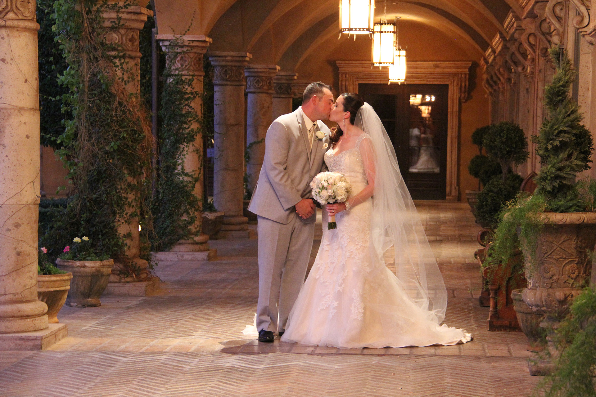 Lauren walked down the aisle in a gorgeous ivory gown with a white tulle and lace overlay, sweetheart neckline with beaded accents, and lace straps. She accessorized with a simple solitaire necklace, drop earrings, and a full veil. Her bouquet featured ivory roses, some tinged with pink, and baby’s breath, wrapped with a white ribbon. Her four bridesmaids wore pale pink, one-shoulder, floor-length dresses with lace bodices and satin ribbon waists. They carried smaller versions of Lauren’s bouquet.