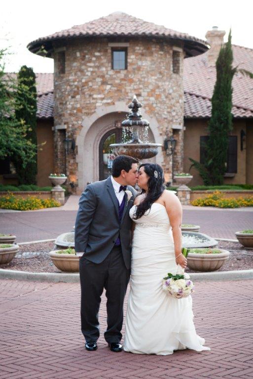 For her wedding, Natalie wore a strapless gown with a crystal beaded belt and rouching across the front of the dress. A veil was fastened in her hair and she carried a bouquet of purple and white roses and calla lilies. Her bridesmaids were dressed in purple gowns with the maid of honor in a deep plum gown and the bridesmaids in violet gowns. Brad was dapper in a grey tuxedo with piping, a purple vest and purple bowtie. His groomsmen were dressed to match except they wore purple ties instead of bowties.