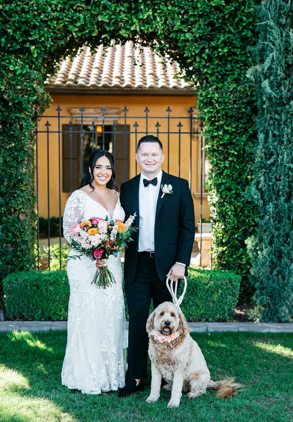 Set entirely outdoors in a charming courtyard, both the ceremony and reception embraced nature, color, and heartfelt moments. One of the most memorable highlights came early on, when the couple’s beloved dog proudly joined them during the ceremony, instantly melting hearts and setting a relaxed, personal tone for the day.