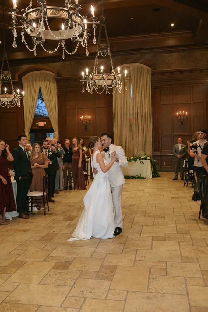 The reception continued the classic elegance with a thoughtfully crafted dinner menu, featuring a traditional Caesar salad, creamy mashed potatoes, tortellini primavera, and a decadent beef tenderloin finished with a cognac cream sauce. For dessert, guests enjoyed a stunning three-tier wedding cake, with red velvet, almond, and chocolate flavors delighting every palate.