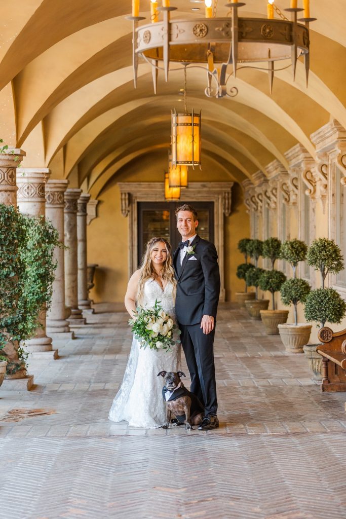 Sara looked radiant in a sleeveless sheath gown with a V neckline and an embroidered overlay. She accessorized with a pearl necklace and a full-length veil with embroidered trim. Her bouquet featured white roses and peonies with botanical accents. Her six bridesmaid wore coordinating full-length sage green dresses. They carried modified versions of the bride’s bouquet.