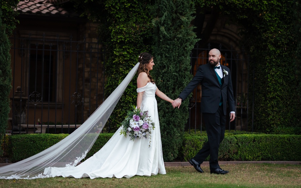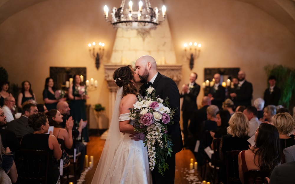 Surrounded by 95 of their closest family and friends, the couple said “I do” during a beautiful outdoor ceremony accented with dark green, light purple, and cream tones, warmed by gold and natural wood details. Bridesmaids stunned in dark green dresses while the groomsmen kept it classic in black tuxes with green vests.